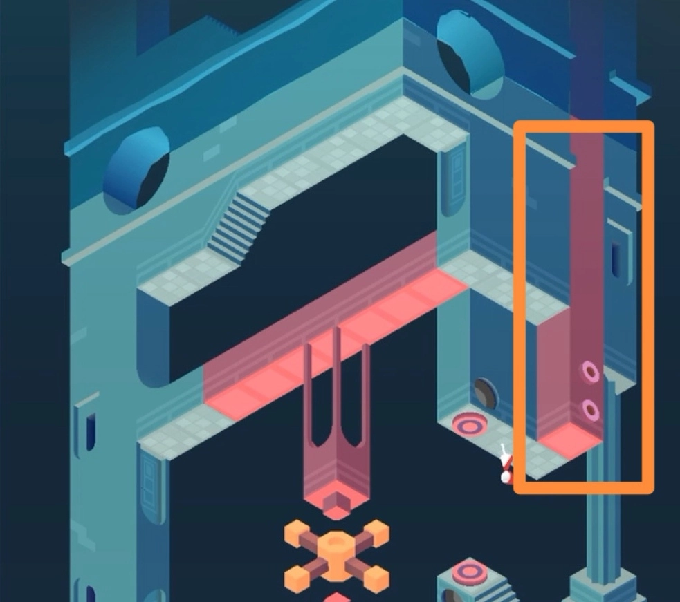 第三个场景的操作步骤是:先把建筑挪到下图指定的位置,让女儿站到建筑上,随后下移建筑并转动方向,这样女儿就能通过梯子触碰到粉红色按钮;建筑升高后,从梯子爬上去,再次转动建筑并使其上升,女儿就能进入门内,萝尔也就可以跟着进到门里了。 第四个场景:首先移动带有粉色墙孔的建筑,让女儿去按压蓝绿色按钮,进入传送门后会到达另一个可移动建筑,接着去按粉红色按钮,再次进入传送门后按压黄色按钮,之后前往最后一道门即可。 场景五需要至少三次改变建筑的形状,帮助萝尔靠近发光小人。 最后一个场景中,玩家要先控制小人点击梯子下方的蓝绿色按钮,再点击粉红色按钮,就能前往图腾处,完成这一关卡。