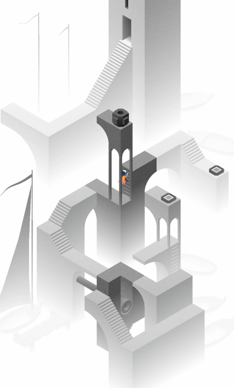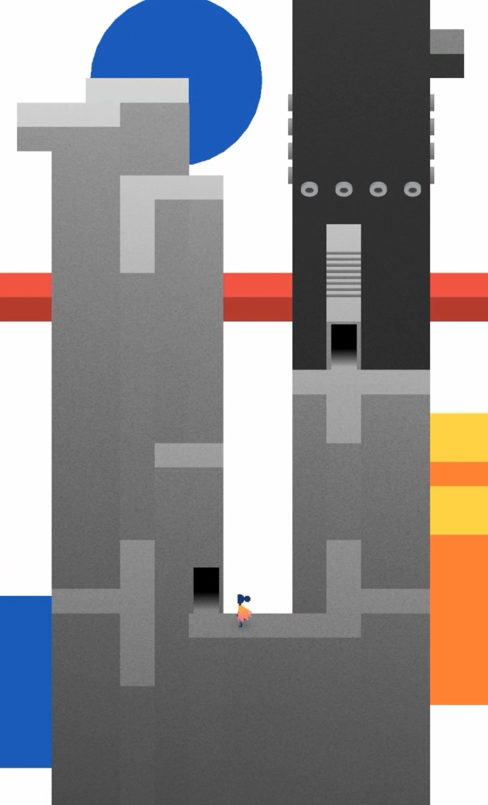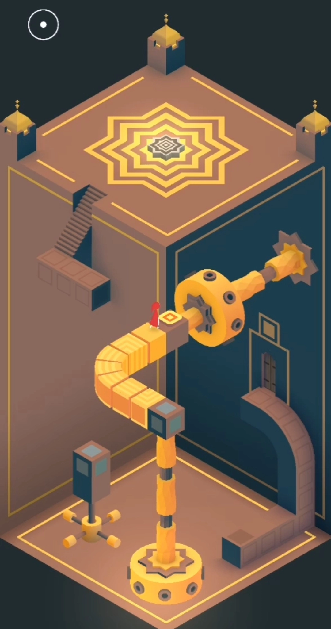 场景三的操作步骤如下:首先把建筑调整成下图所示的形态,随后让小人进入传送门,小人会从中间那一层的门出来;接着再次旋转建筑,使其拼接成楼梯,方便小人向上攀爬;最后通过三次旋转操作,就能引导小人进入最终的门了!场景四里的凸弧形墙和凹弧形墙都能移动,先借助凸墙移动到前侧的灰色按钮位置,再移动到另一个按钮处,图腾就会出现,到这里本章就结束了。