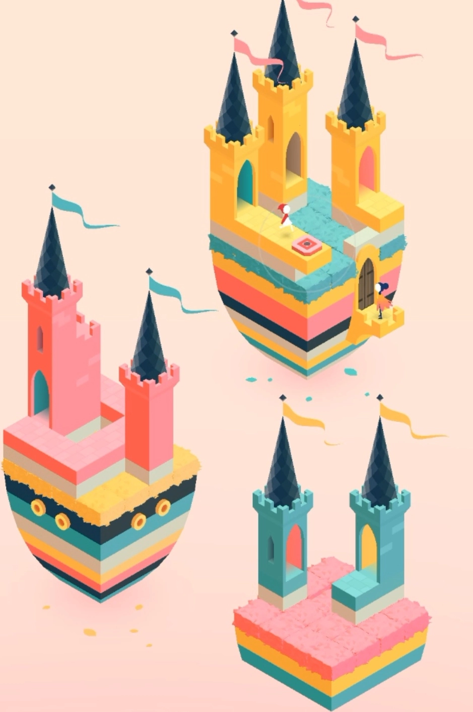 第四章:首先引导萝尔母女通过梯子爬到建筑的最顶层,随后两人分别按下两个按钮,使门显现出来,接着进入门内,场景发生转换。第二个场景中只有萝尔一人,需要向右转动建筑,让萝尔靠近发光的小人,从而进入下一个场景。第三个场景里,借助移动板让两人到达断层的另一端,女儿按下的粉红色按钮会使建筑升起,搭建出一段通路。此时先让女儿去按远处的粉红色按钮,之后萝尔进入门内,再让女儿按左边的粉红色按钮,萝尔则按住圆形浅黄色按钮,同时转动圆柱,让女儿能够来到萝尔所在的位置,两人一同进入门内。