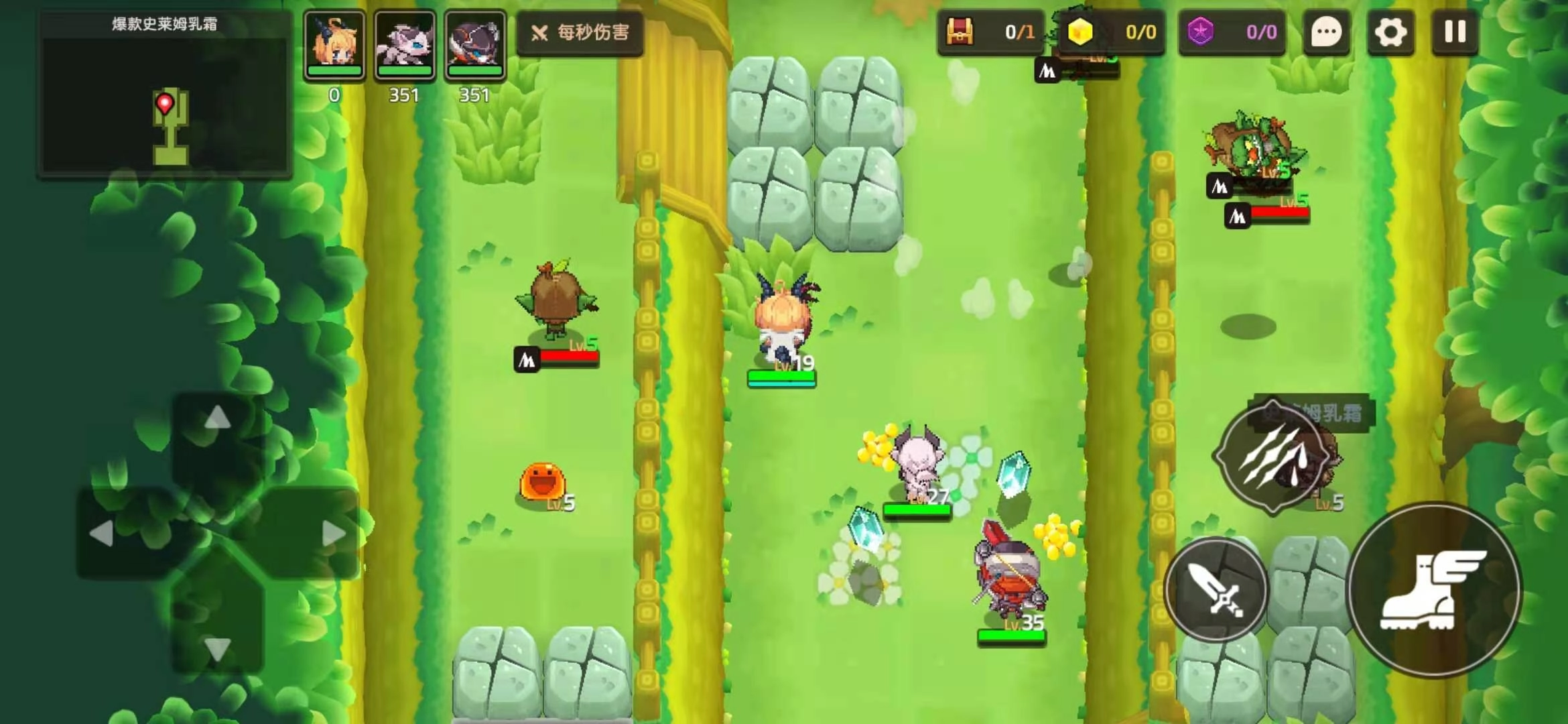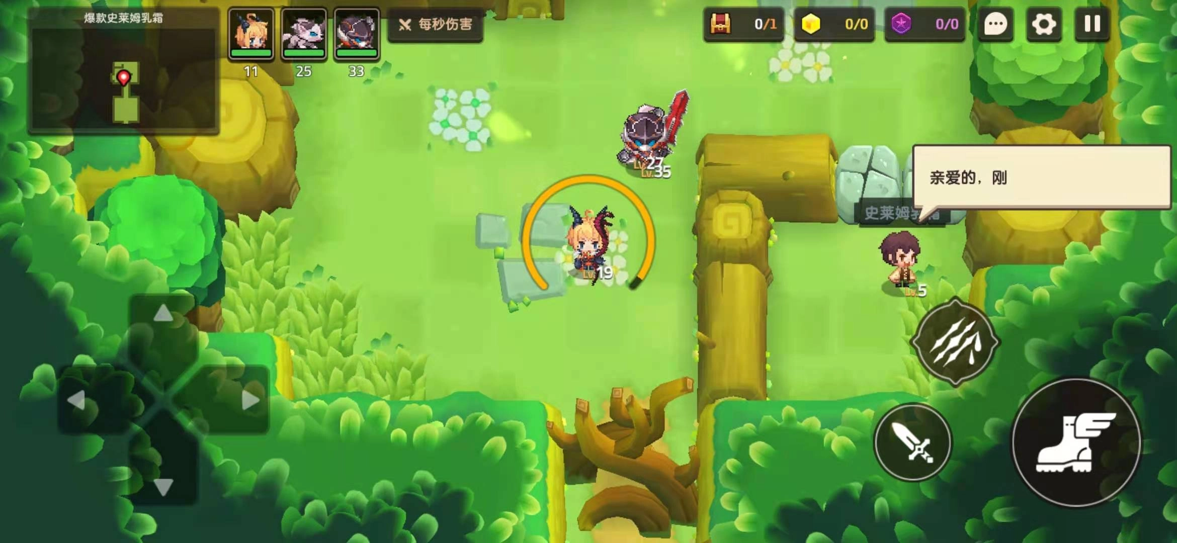 进入游戏后,能看到两个NPC,他们提到要找一种乳霜。顺着路线前进,就会碰到怪物,我们只需用技能持续输出就行。继续往前走,会遇到一群哥布林,击败它们后,还有石头挡路,把石头击穿就能走到上面去了。