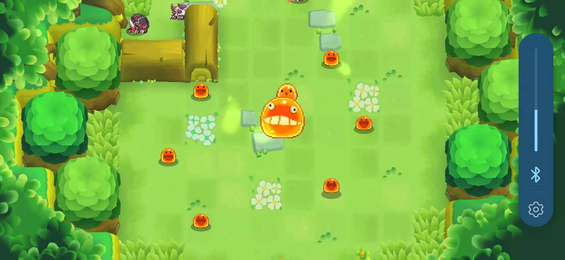 走上去之后会遇到跳板,借助跳板能跳到对面的山面,接着就能击败上面的哥布林。之后顺着楼梯往下走继续前进,途中会碰到几棵树,把树砸碎就能得到果子,用来恢复血量很方便。最后会遇到一个NPC,击败他就能拿到最后一只史莱姆,完成任务。这样一来,游戏就能通关了。