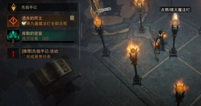 这个任务实际上就是先祖手记里提到的“遗失的符文”任务,完成它的要求是把九盏魔法灯全部点亮。大家在做任务时能注意到,每当我们点亮其中一盏灯,这盏被点亮的灯就会朝着四个固定方向发射火球,这些火球会落到附近的其他灯上。要是周围的灯原本没亮,就会被火球点亮;可如果灯本来就是亮着的,那么火球就会让它熄灭。