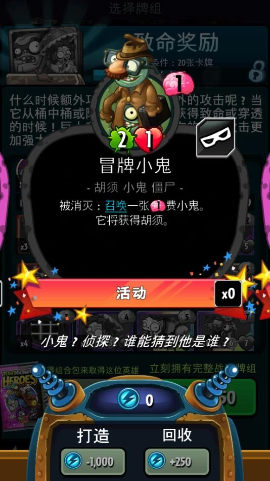 接下来是僵尸系卡牌的推荐。在僵尸系里,玩家前期只能获取超尸这一英雄选项,因此我带来的推荐是比较适配该英雄的。基础卡牌建议选择小鬼、台球僵尸、臭气僵尸和鼓手队长。这几个单位中,小鬼和台球僵尸的召唤消耗较低,但作战能力相当出色;臭气僵尸与鼓手队长则能为队伍提供属性加成,帮助玩家在开局阶段不至于处于劣势。