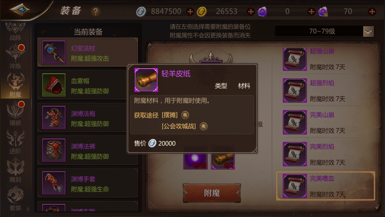 关于附魔,14件装备每件都得用完美卷轴来附魔,而且每7天就要重新附一次,消耗确实特别大。不过好在材料不算太难弄,商城和拍卖行都能买到。