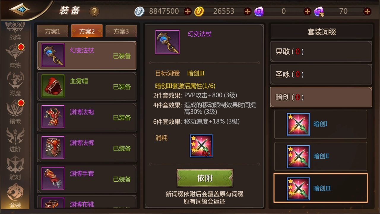 套装效果需要通过副本获取各类词缀,这肯定是必不可少的;不过之前下副本时应该已经积累了不少,所以把它们拿出来用吧,记得一定要用3级的哦。