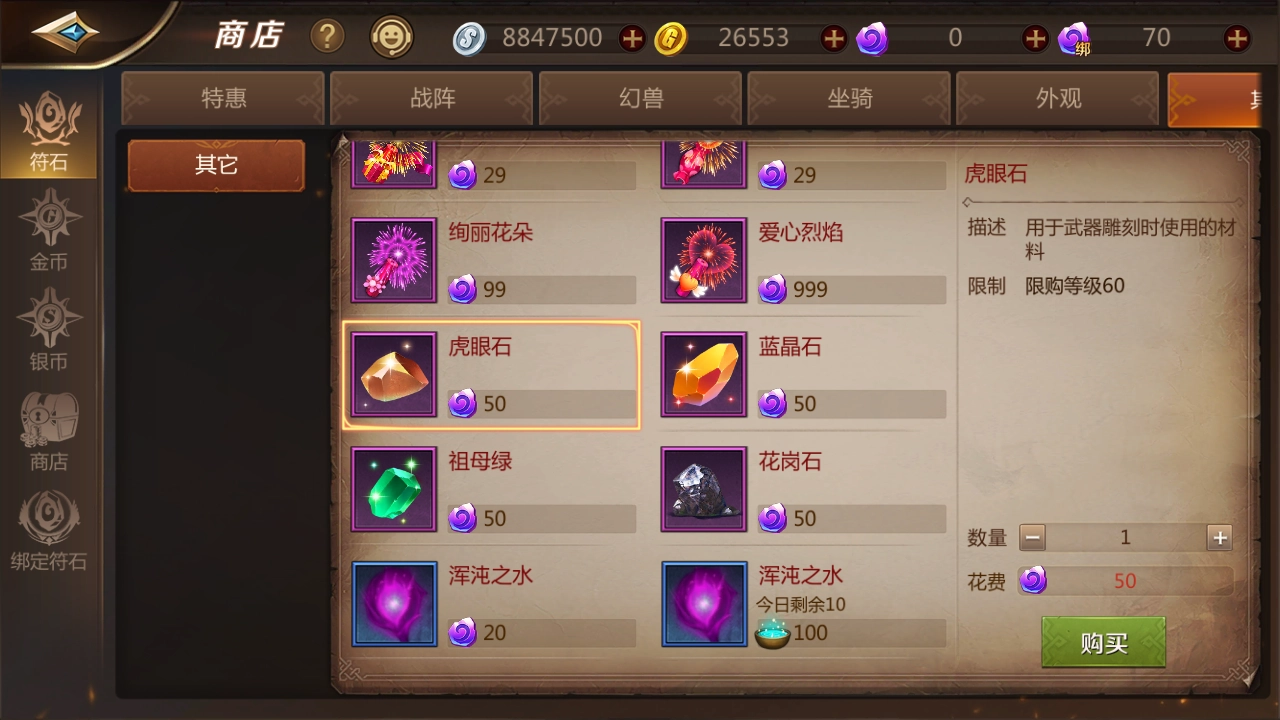 雕刻需要虎眼石这类材料,获取途径不少,副本、商城都能得到。既然我们都打定主意要打造最强装备,那肯定得投入些成本。要是自己手头没有存货,还是从商城购买比较好,一个50符石,每种先买2个就行,后续需要了再补购。