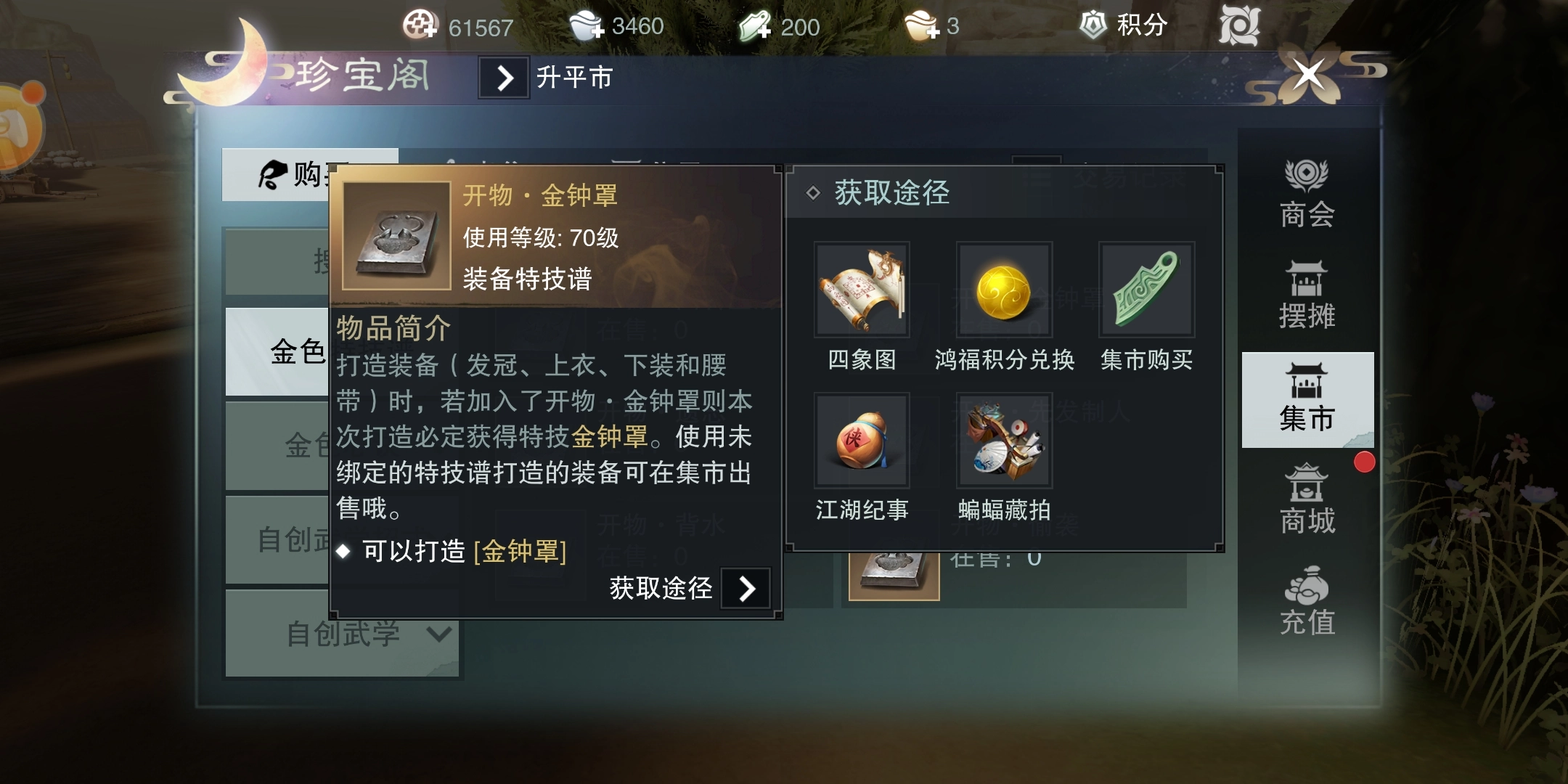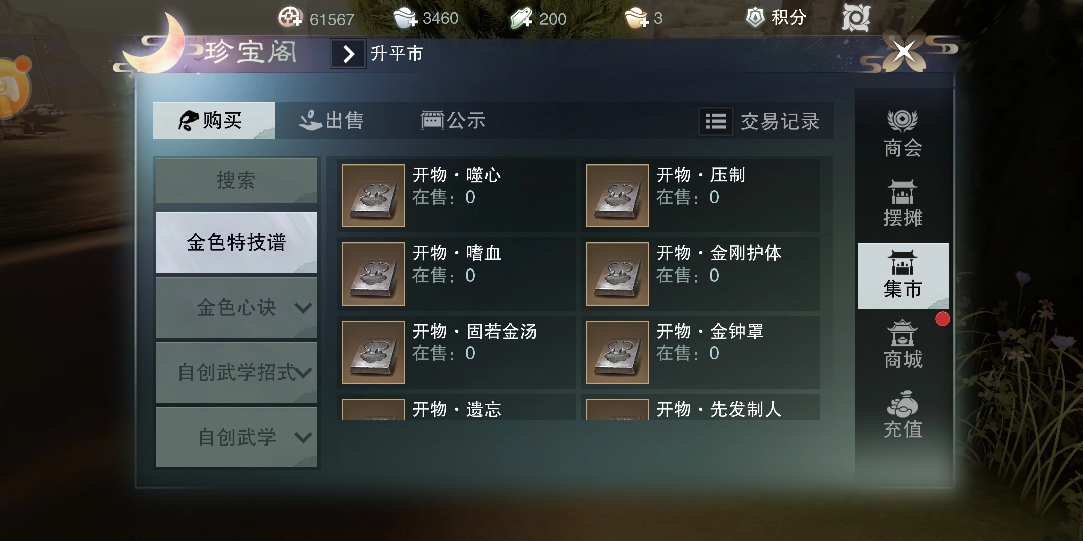 集市上有一些五级特技谱,能给特定位置的装备附加指定特技。不过别以为商城里有就能买到,这得看运气。每次更新时,总有资深玩家守着抢先购买,等你想起来要加特技,早就卖光了,所以在这儿买到的机会不大。就算偶尔有货,也未必是你需要的,这材料全靠碰运气。
