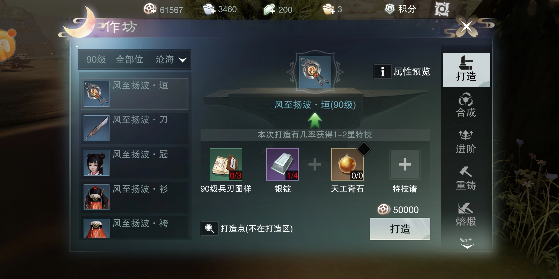 想要获取高等级特技,所需材料十分珍稀,打造时需加入天工石头,还得用到集市购买的特技谱;至于其他等级的特技,每次锻造都有一定几率产出。而且每次打造出的装备,其属性都会比普通装备高出一截。