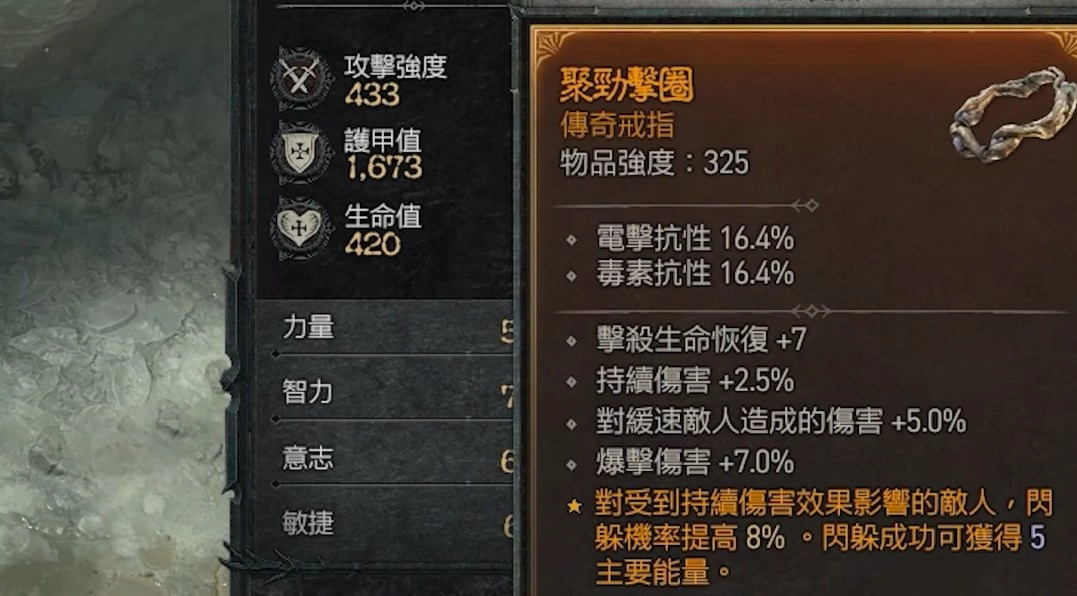 另外,要是你刷到了像图里那样带有传奇效果的装备,打屠夫也会轻松不少。这个效果是当敌人处于持续伤害状态时,自身闪避率提升8%——别看数值只有8%,实际用起来几乎每次都能躲开攻击,对付屠夫再合适不过了。