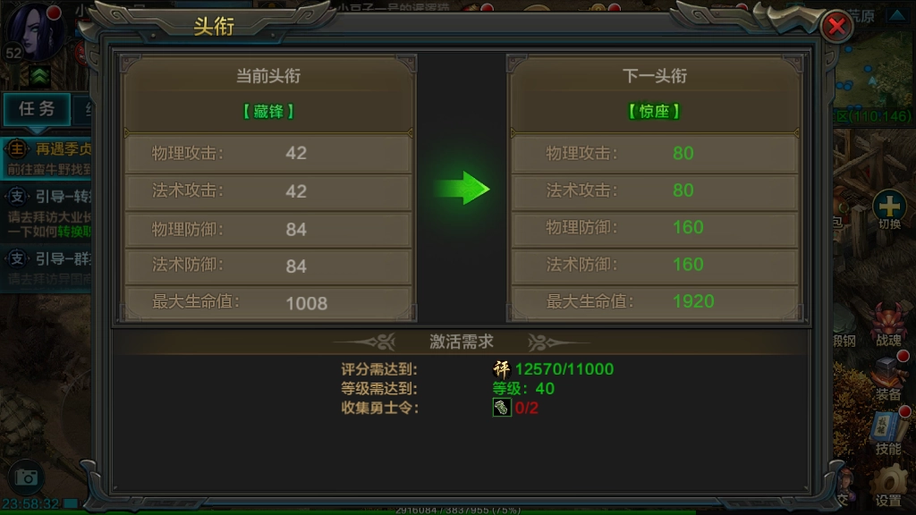 在头衔系统里,我们既能查看自己当前的头衔,也能了解即将进阶的头衔,同时还能看到对应的属性变化。