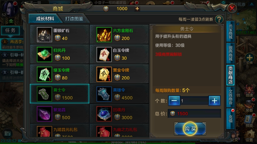 其次是通过贡献值购买,直接在商城里的贡献商城就能操作,每块需要消耗1500贡献值。
