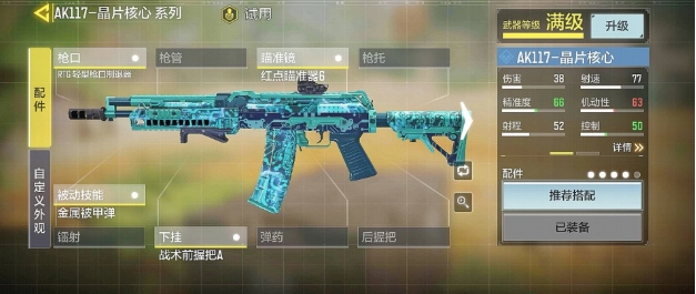 AK117的配件推荐如下:RTG轻型枪口制退器、红点瞄准镜6、被动技能选择金属被甲弹、战术前握把A。这套配件虽然只有四件,但从整体性能来看利用率是最高的,主要提升的属性集中在精准度和稳定性方面。当然,其他战术配件也可以使用,但考虑到伤害不足的情况,这套组合能带来更显著的收益。