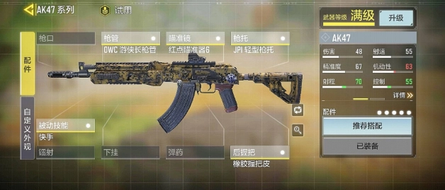 AK47的顶级配件组合推荐:OWC游侠枪管、红点瞄准镜6、JPI轻型握把、被动技能快手、橡胶枪托皮。这套配件组合虽然在武器操控性方面存在一定短板,但在射程和稳定性上有显著提升。可能不少玩家为了让武器性能发挥到极致,还会选择搭配扩容弹匣,不过在使命召唤手游中,扩容弹匣的实际使用率其实并不高。