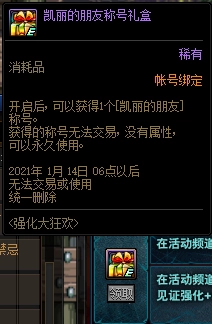 凯丽的朋友这一称号其实不具备任何属性加成,而且无法进行交易,仅能当作外观装饰类道具使用。不过,关于它存在一些玄学说法——据说成为凯丽的朋友后,冥冥中能提高装备强化的成功率。至于这些玄学说法到底有没有实际效果,就得靠玩家们自己去尝试和验证了。