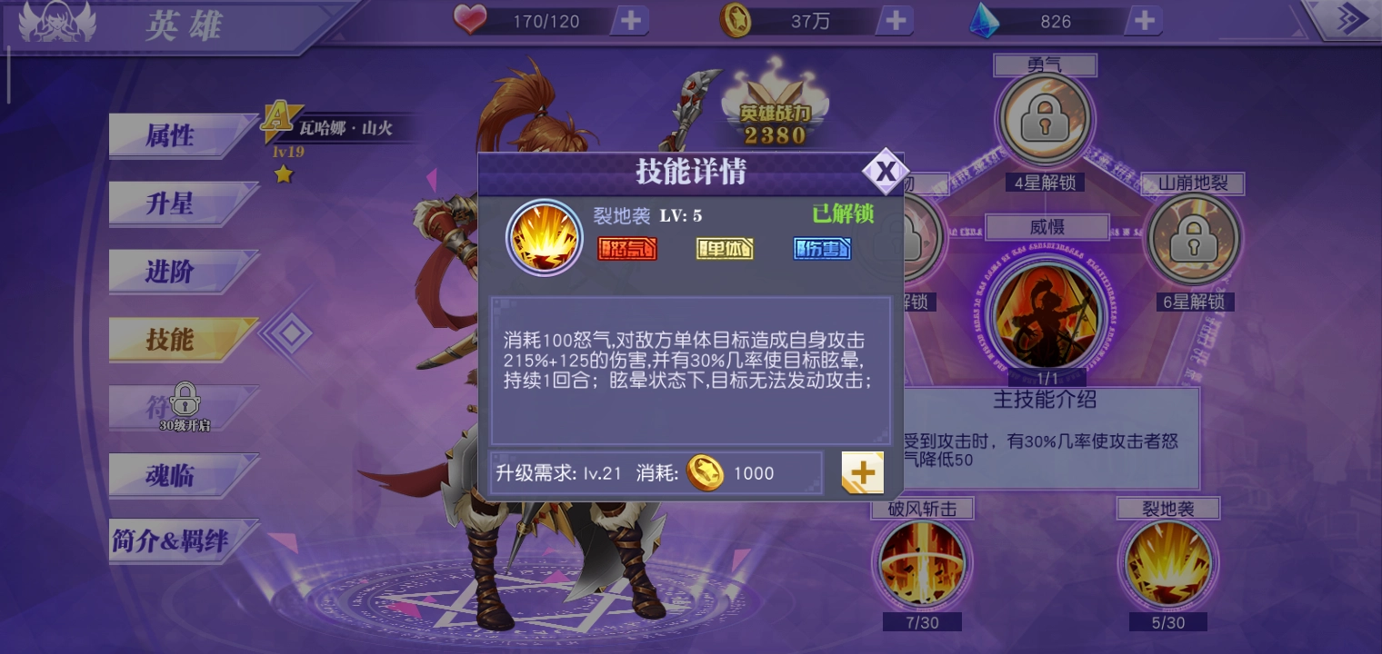 其次是防御型英雄瓦哈娜,作为一名坦度英雄,她的定位更偏向控制路线。她的技能包含能降低敌方目标怒气值的破风斩击,以及可眩晕敌人的崩地袭。当她达到4星觉醒状态后,解锁的被动技能“勇气”还能进一步提升其眩晕概率。