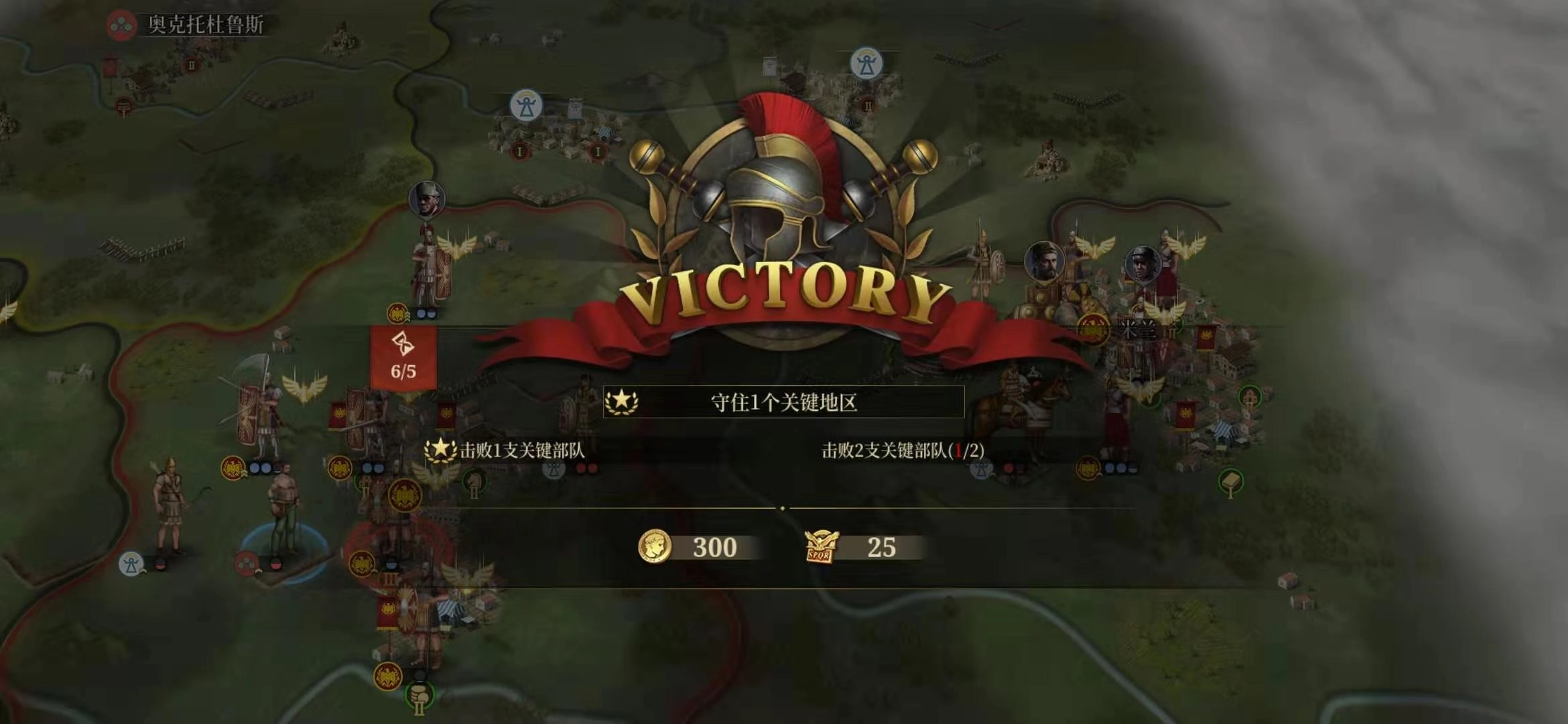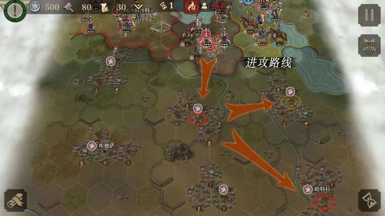 接下来开始攻占克拉苏,待彻底占领后,将领苏雷纳会朝右下方逃窜,这时直接派遣部队进行包夹并消灭他。由于整个地图的核心是中心城,因此玩家需要尽早夺取卷轴奖励城市,然后再向四周逐步攻克其他目标。