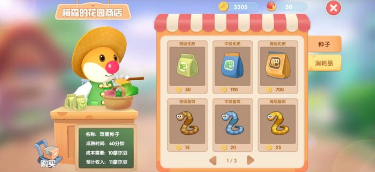 摩尔庄园手游里的梅森经营着花园商店,既能为玩家提供丰富的商品,也会收购玩家产出的部分商品。此外,梅森还会在游戏里为我们完成某些任务提供指引,所以他是玩家在游戏中频繁接触到的角色。