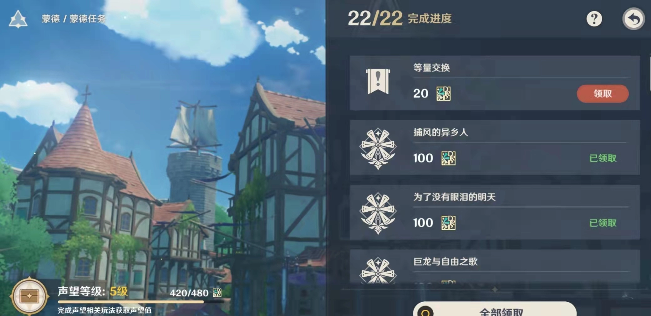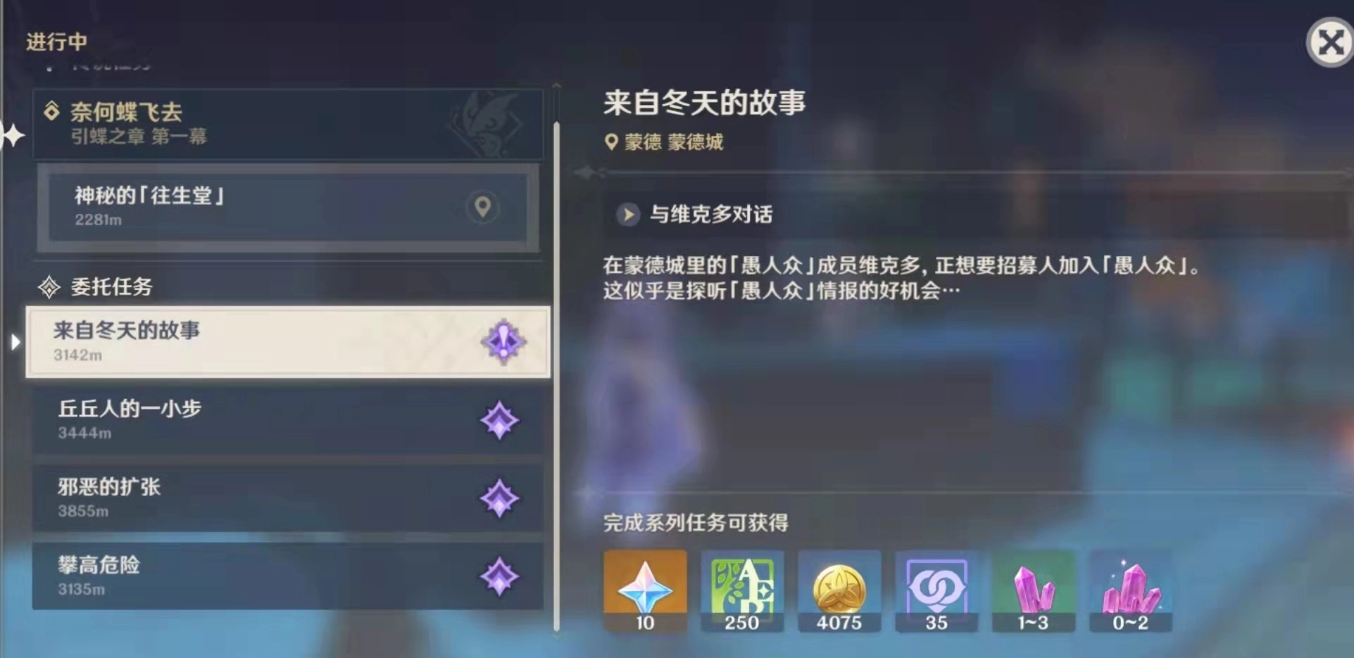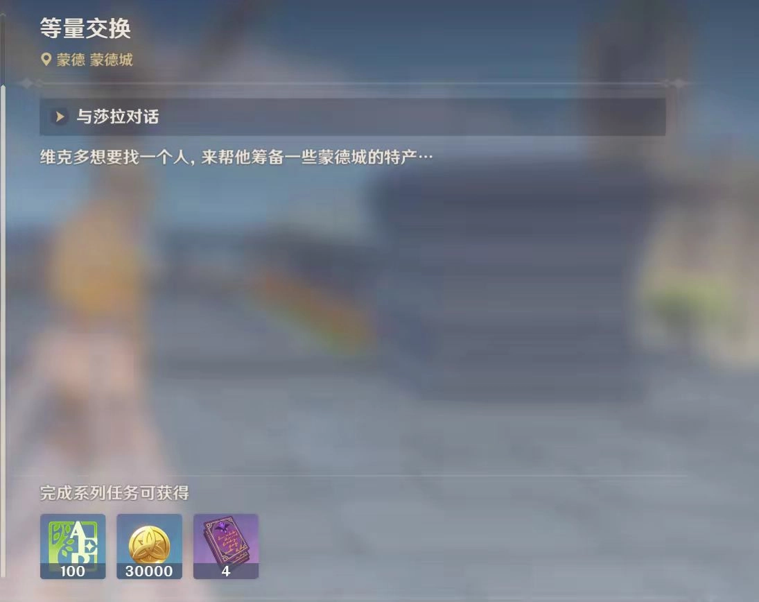 等量交换任务是通过每日委托随机刷新的,玩家能否触发全凭运气,很多50多级的玩家都还没刷到,确实没什么办法。不过这个任务有个触发前提,就是要先完成“来自冬天的任务”。大家可以在右上角征讨书的委托界面里,把每日任务的刷新地点切换到蒙德。完成等量交换任务后,还能去蒙德声望NPC那里领取20点声望值。