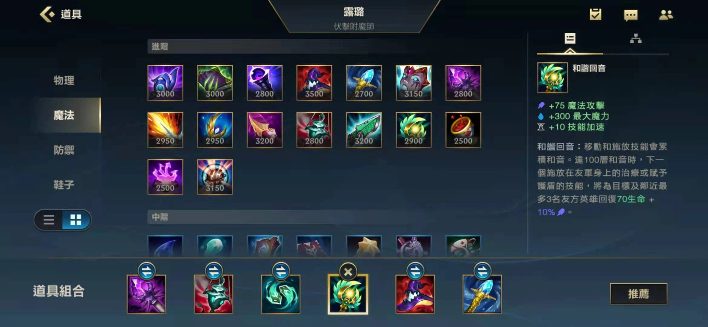 中单璐璐的第一件装备推荐时光之杖,这件装备能同时提升她的生命值、法术强度和法力值,让璐璐拥有更充足的资源持续释放技能。鞋子选择冷却缩减鞋,之后升级成双生暗影,这件装备附带的主动效果可以追踪并减速敌人,提升璐璐的留人能力。第三件装备出香炉,它能为队友提供攻速加成和伤害增益,对团队的辅助效果十分显著。后续再补出和谐回音、灭世者的死亡之帽以及瑞莱的冰晶节杖等装备就可以了。