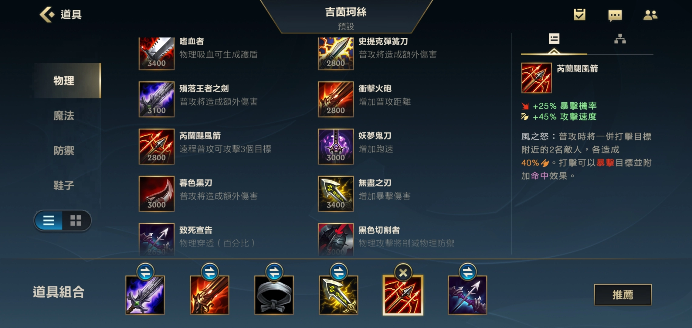 第五件装备选飓风准没错,它能有效提升金克丝的输出能力——飓风的被动效果能让金克丝普攻附带额外伤害,团战时一次平A能同时打到多两个目标,这样更容易刷出被动。毕竟要是团里敌人被击杀时自己没拿到助攻,就没法触发被动打出最高伤害了。