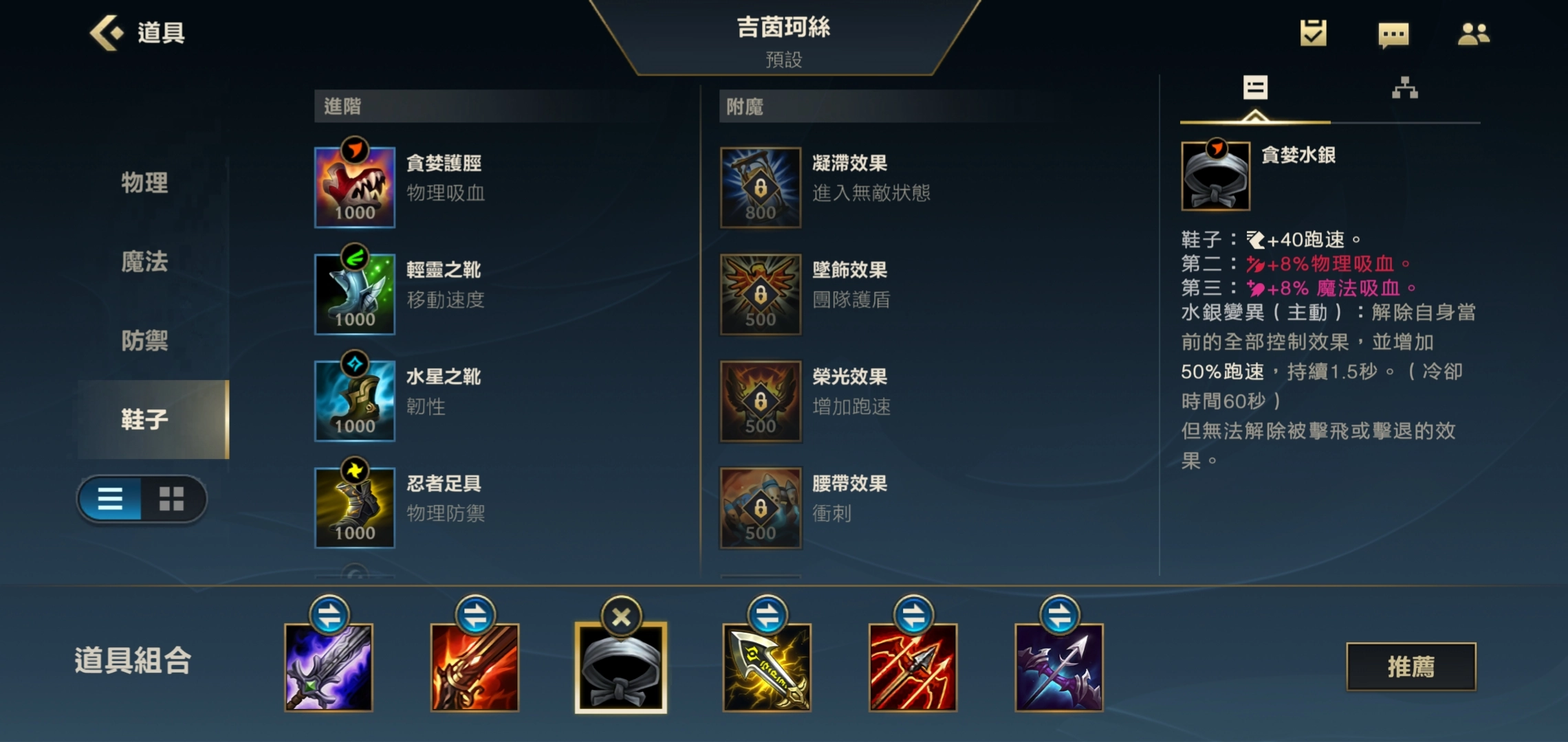 金克丝能够作为收割型AD承担输出任务,各位玩家的第三件装备可以将吸血鞋更换为水银鞋,在团战的关键时刻利用水银效果来提升移速并解除控制,以此确保自身能够持续进行输出。
