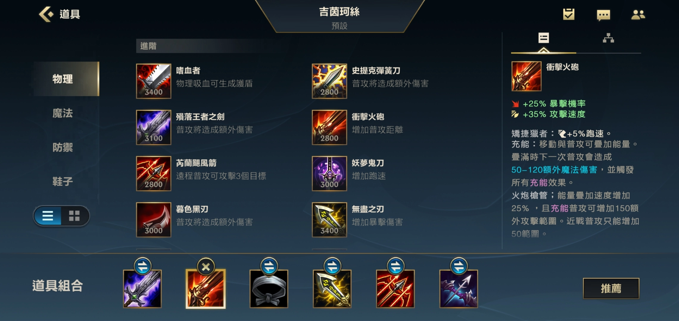 第二件装备我们选择火炮,这件装备能有效提升我方的移动速度、攻击速度和暴击率这三个属性,并且火炮的充能被动还可以显著增强金克斯的射程与伤害输出能力。