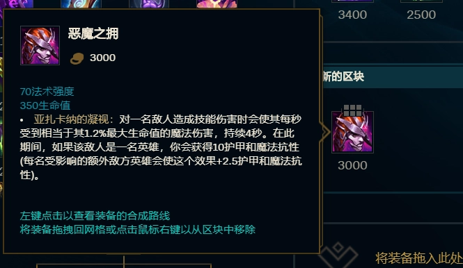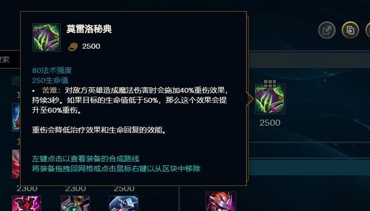 第二件要出的大件得带生命值加成,考虑到死歌被动的特性,他能走半肉路线去扛伤害。所以这时候可以选【恶魔之拥】或者【莫雷洛秘典】。