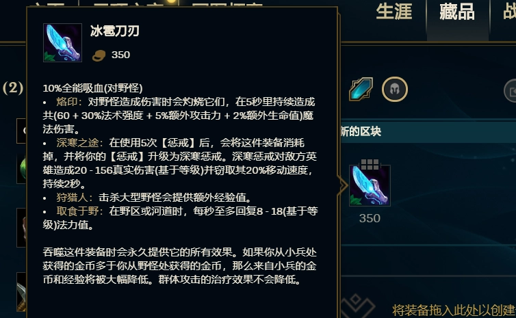 出门时可以选择【冰雹刀刃】这件装备,它是AP打野英雄常用的装备,其被动效果【取食于野】能够帮助死歌更高效地回复法力值。