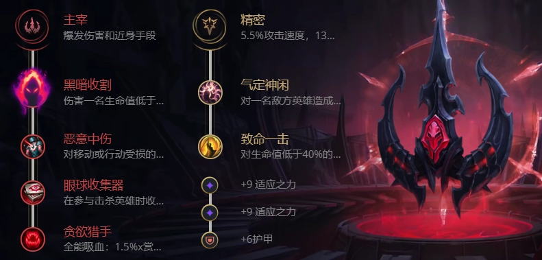 基石符文选【黑暗收割】,副系搭配【精密】,其中核心的【气定神闲】要点出来回蓝。