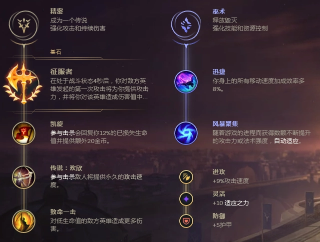 德莱文在做出三件核心装备后,开启【征服者】进入作战状态,四秒后接下来的三秒内,会获得6到35点攻击力加成,同时附带20%的真实伤害。这对脆皮英雄来说堪称噩梦——德莱文的一刀下去,脆皮基本会被打成大残,甚至可能直接被一刀秒杀。另外,符文【迅捷】还能很好地契合他W技能带来的移动速度加成,进一步提升追击或拉扯的能力。