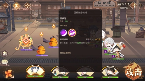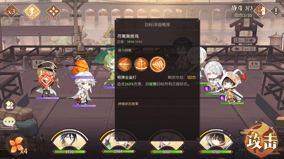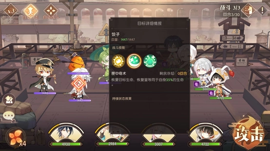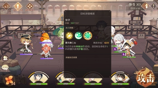 前面两场战斗难度不高,第三场才是本关卡的关键所在。观察敌方阵容,包含饺子、符离集烧鸡、青团和不良鸡。其中饺子属于治疗类角色,其二技能与大招均具备生命恢复效果,尤其是大招能够实现群体恢复,因此我们需要集中所有火力优先对其进行攻击,把全部伤害都倾泻在他身上,所有角色都释放伤害最高的技能,包括大招,必须确保在第一回合就将他秒杀。如果我方队伍中带有治疗型角色,则需根据我方角色的血量状况,来决定是攻击敌人,还是为我方角色加血或添加护盾。