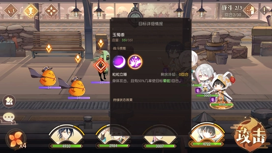 第二场战斗先集中火力对付玉蜀黍,它的技能带有眩晕控制效果,得先把它解决掉,再依次处理剩下的两只不良鸡。特别要注意的是,这场战斗绝对不能释放大招,否则冷却时间会不够,到第三场战斗时就没有大招可用了。
