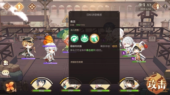 青团的核心作用是净化,我们的输出方式是纯粹的技能伤害,并非依靠毒性效果使敌人持续掉血来赢得胜利。目前可以暂时不用管青团,我们的次要攻击目标是符离集烧鸡,原因在于它在敌方队伍中的伤害值是最高的,并且其大招属于群体攻击技能。如果有大招就释放大招,没有大招的话就使用二技能,要以最快的速度将它消灭掉。