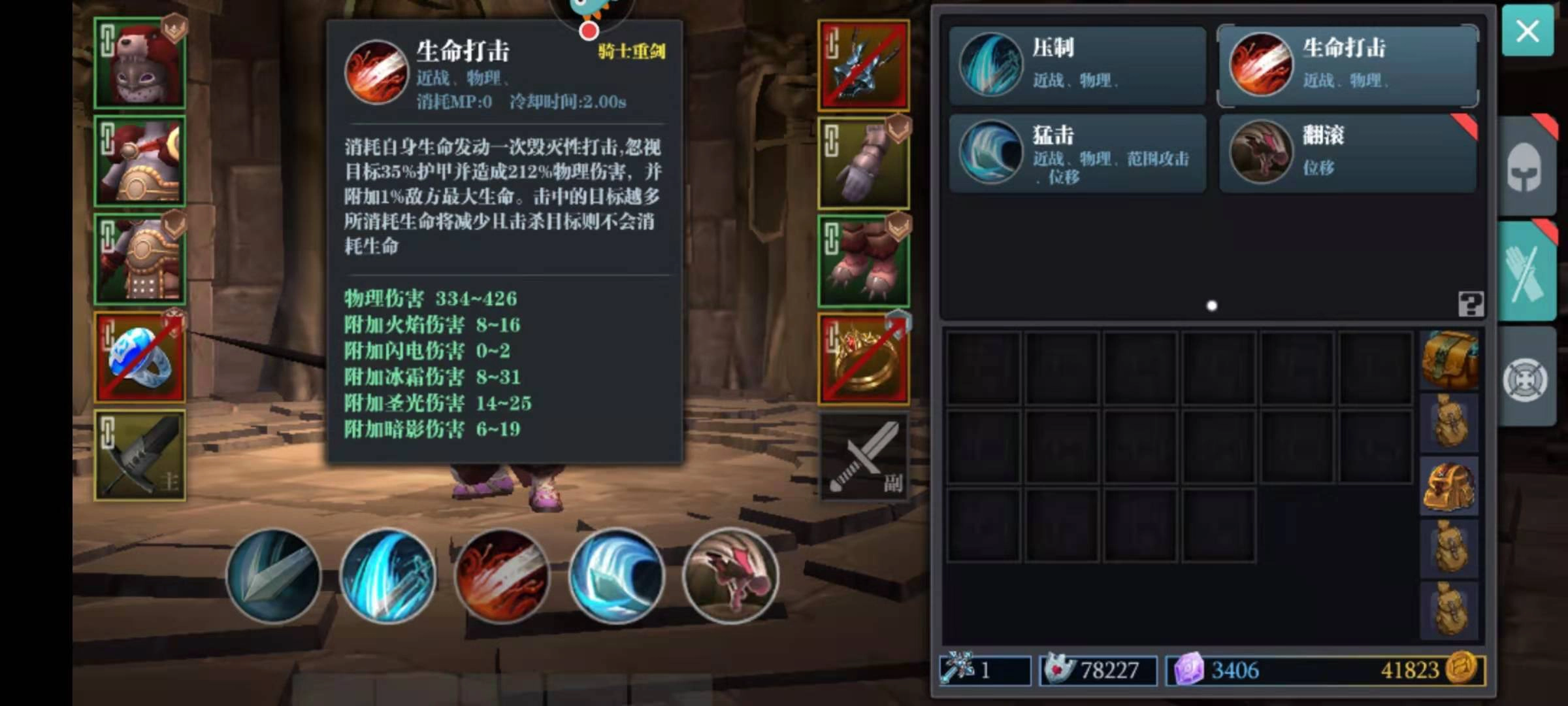 力量方向的大剑通常会选用斩杀、猛击、无畏打击这类高爆发的范围伤害技能,这类技能对武器伤害的要求要高于对力量属性的要求;而体力方向的重剑则更注重通过撕裂、生命打击等技能来进行输出,由于生命打击需要消耗自身血量来释放,因此必须增加体力点的投入才能满足需求。