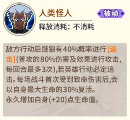 饿狼的普攻强击手刀针对单体目标发起攻击,还能让目标叠加内伤状态;而追击带有内伤效果的目标时,他会附加等同于自身100%攻击力的额外伤害,这伤害量相当可观。他的绝技我流拳则是对全体目标发动五连击,每一击都造成100%攻击力的伤害,同时让三名目标陷入内伤,这部分额外伤害达到130%。再搭配被动技能“人类怪人”:敌方行动结束后,饿狼有40%的概率触发追击,造成普攻80%的伤害,每回合最多触发三次;尤其针对英雄单位,只要英雄行动,饿狼必定追击。此外,每场战斗中首次受到致命伤害时,他会以自身最大生命值的30%复活,复活后还能提升生命值上限。这三个技能组合起来效果拔群——输出能力爆表,还有复活机制加持,生存力也拉满。追击时最高能打出210%的伤害,加上每回合三次的触发上限,称他为“战场收割机”毫不为过。