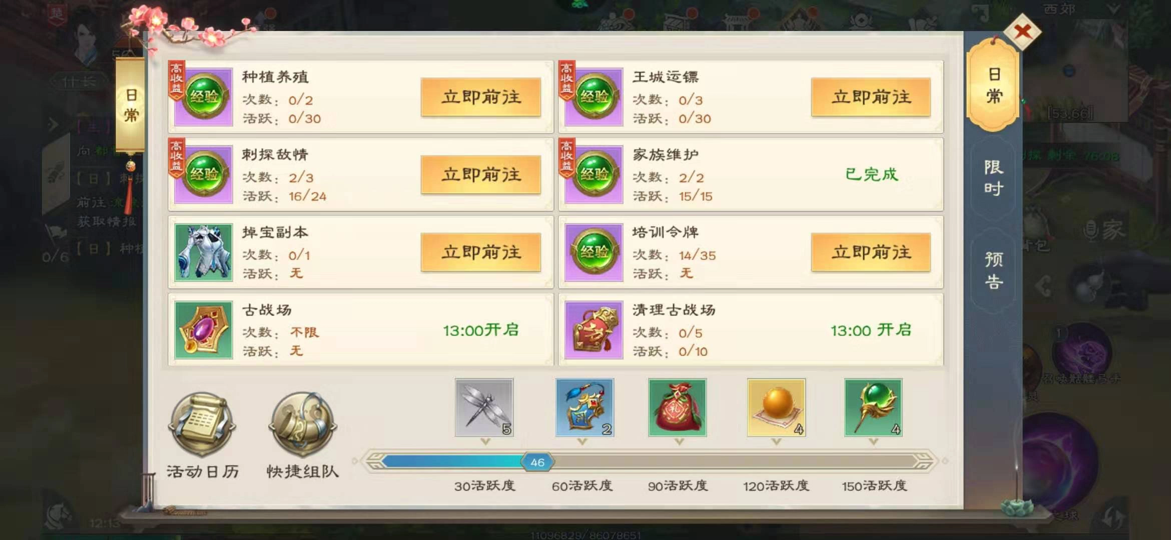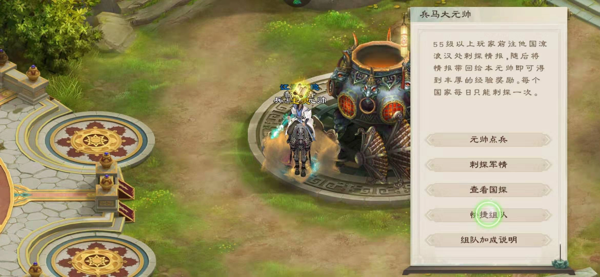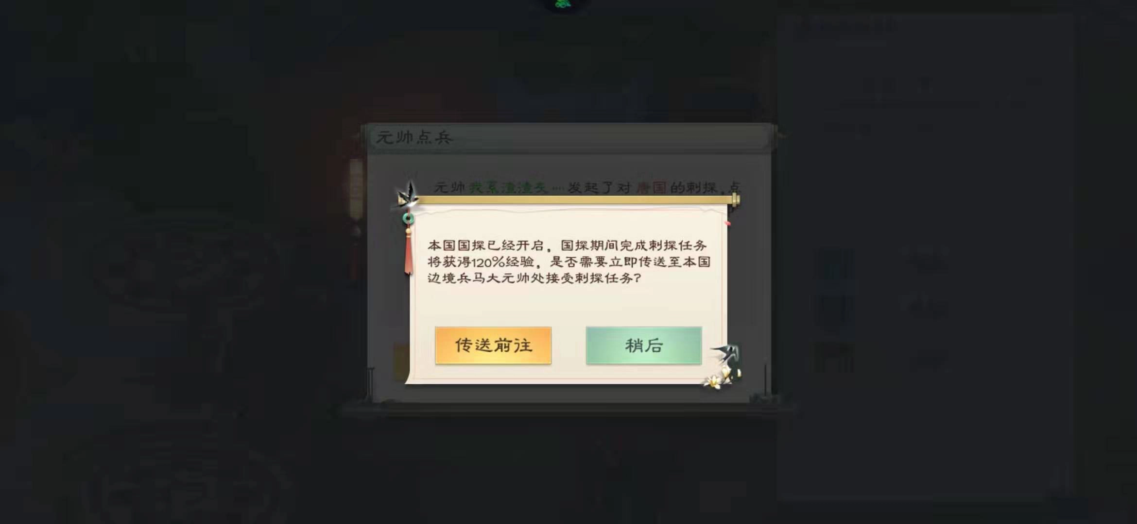 每天中午12点,国家大元帅将开启国探活动。在国探进行期间完成刺探任务,能享受到经验加成;若与家族成员组队参与,还可额外获得一定的经验加成。追求经验最大化的玩家,可别错过这个机会。