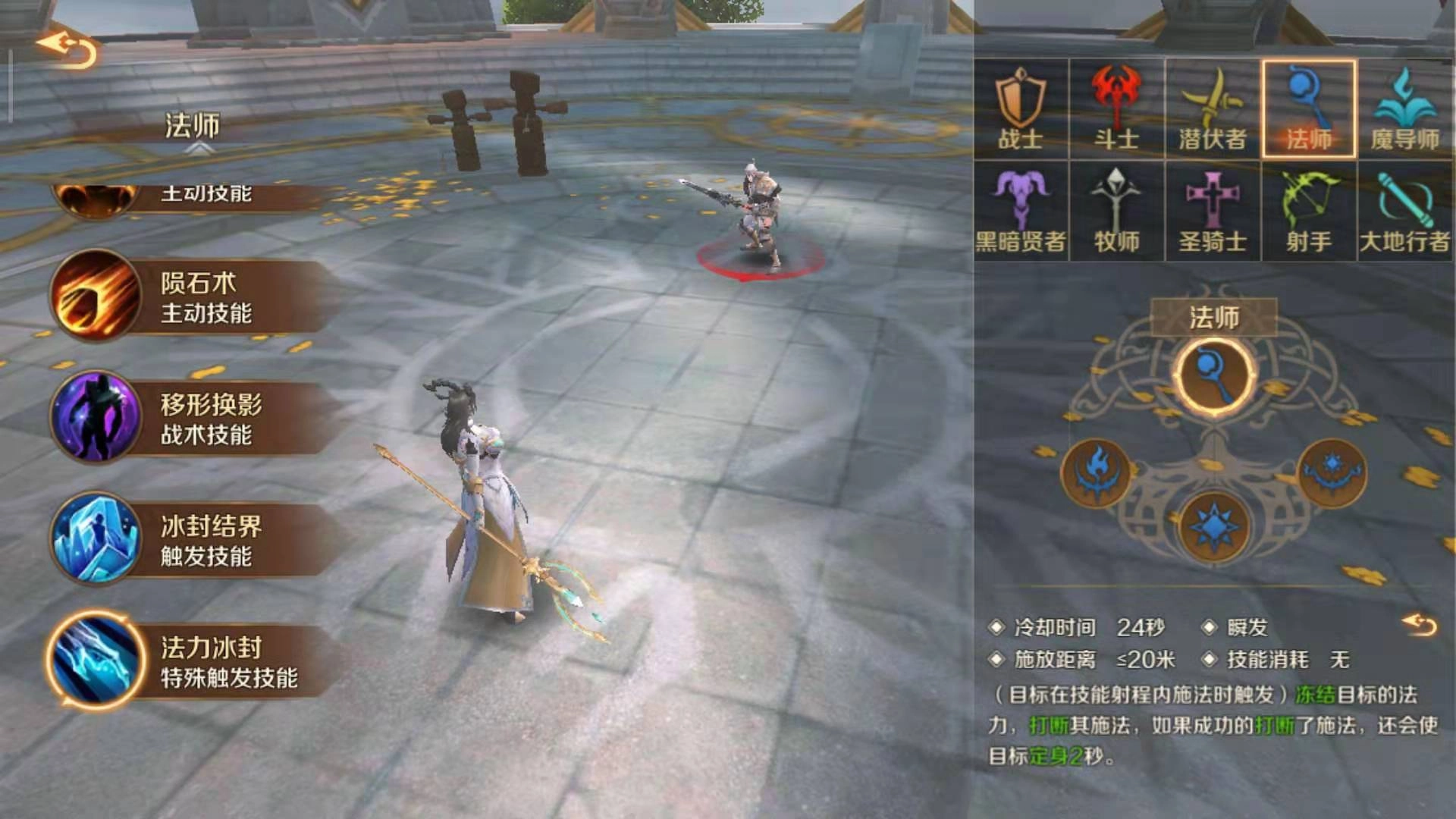接下来是法师的【法力冰封】技能。和斗士的拳击技能不一样,法力冰封的作用范围要大得多,只要敌方在法师20米的范围内,就能触发这个技能。而且,法力冰封还会让被打断技能的敌方单位陷入2秒的定身状态。
