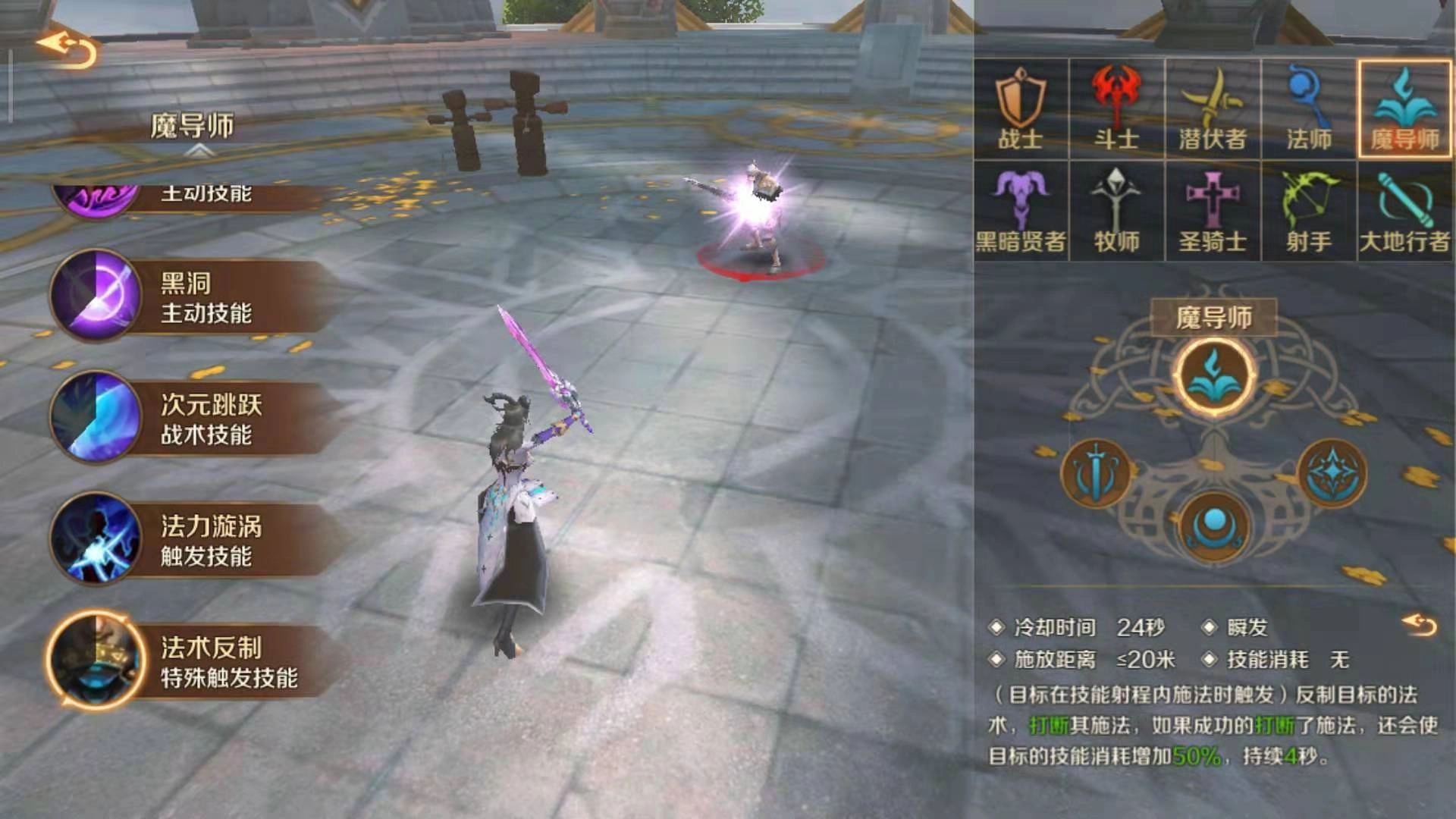 魔导师的打断技能名为【法术反射】,其技能范围与法师相同,区别在于成功打断敌方施法时,会为敌方附加持续4秒的“技能消耗提升”debuff(即使用技能时消耗增加)。