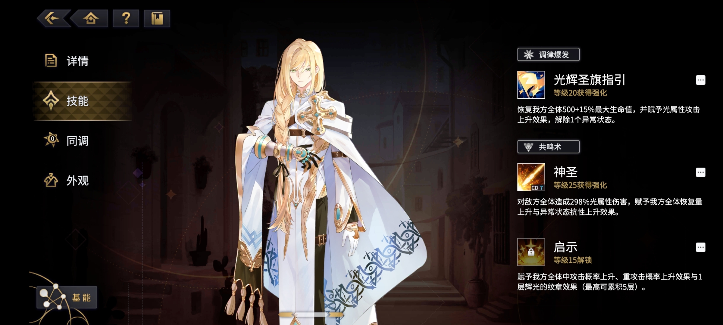 一技能:为我方全体恢复生命值,同时赋予光属性攻击效果加成,还能解除异常状态。这是一个兼具恢复、双重增益效果的技能。