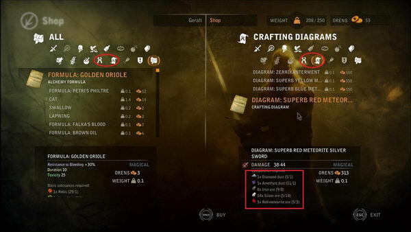 注意红色标注的地方,圆圈内左侧是原料、右侧是图纸,方框类的是需要的材料~毕竟这些都挺贵的。。。我没有~~