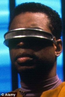 埃米尔-阿米迪博士(左侧)展示了一款“感觉替代装置”,其外观与电影《星际迷航》中角色乔迪-拉弗格(右侧)所佩戴的眼罩十分相似。