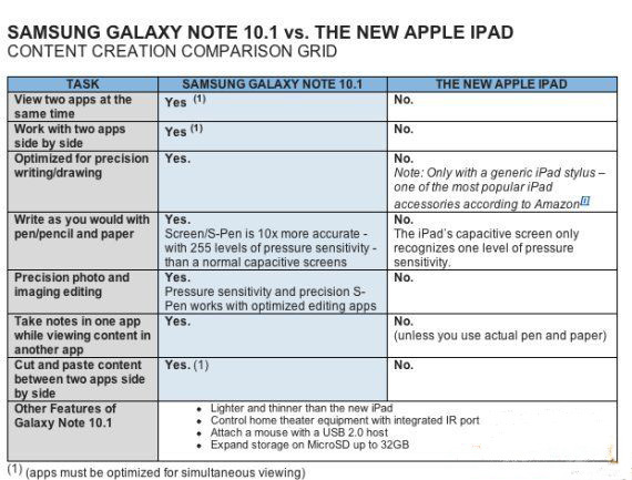 在三星眼中,Galaxy Note 10.1更能契合广大用户的创意需求。三星的这封公开信恰好在苹果周三发布新iPad之后发出,颇具挑衅意味。信中三星还特意附上一张对比表,从多个维度对Galaxy Note 10.1与新iPad展开了比较。