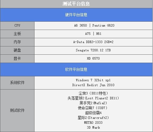 我们的测试平台测试平台采用的是A63650+A75,PeniumG620+H61+HD6570的组合,因为在实际的选购中这二者的平台价格更加接近。测试分为几个方面,包括单独使用HD6570测试,单独使用集显运行测试和采用双显卡混合交火进行相关测试。