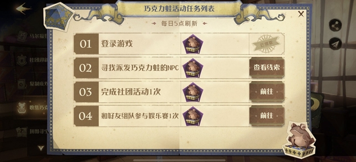 那巧克力蛙该怎么收集呢?第一个办法是每天登录游戏,然后在巧克力蛙收集的活动页面打开,就能固定得到一个巧克力蛙礼盒。这可以说是无论如何都必须拿到的。第二个是寻找派发巧克力蛙的NPC,这个和我们拼图解谜的玩法挺像的。比如9月16日我们要去礼堂门口找NPC卡珊德拉对话,就能获得一个巧克力蛙礼盒。