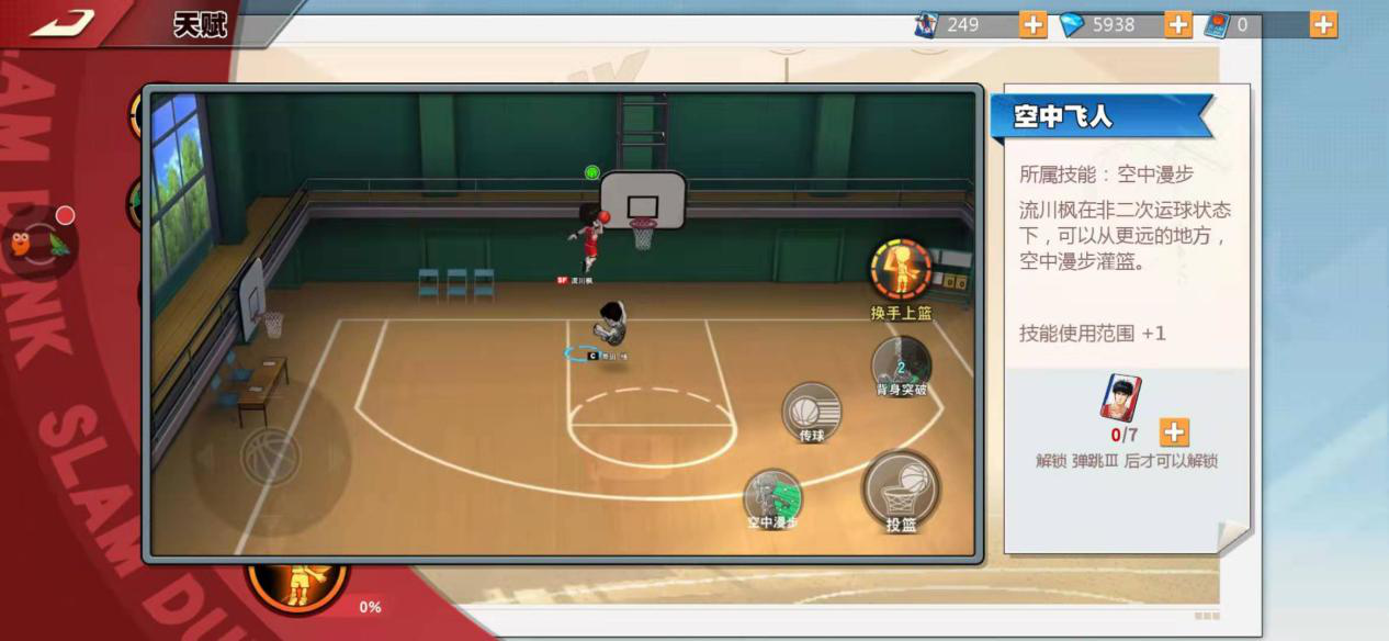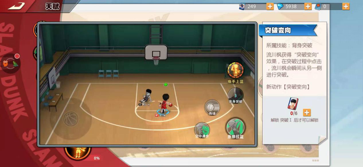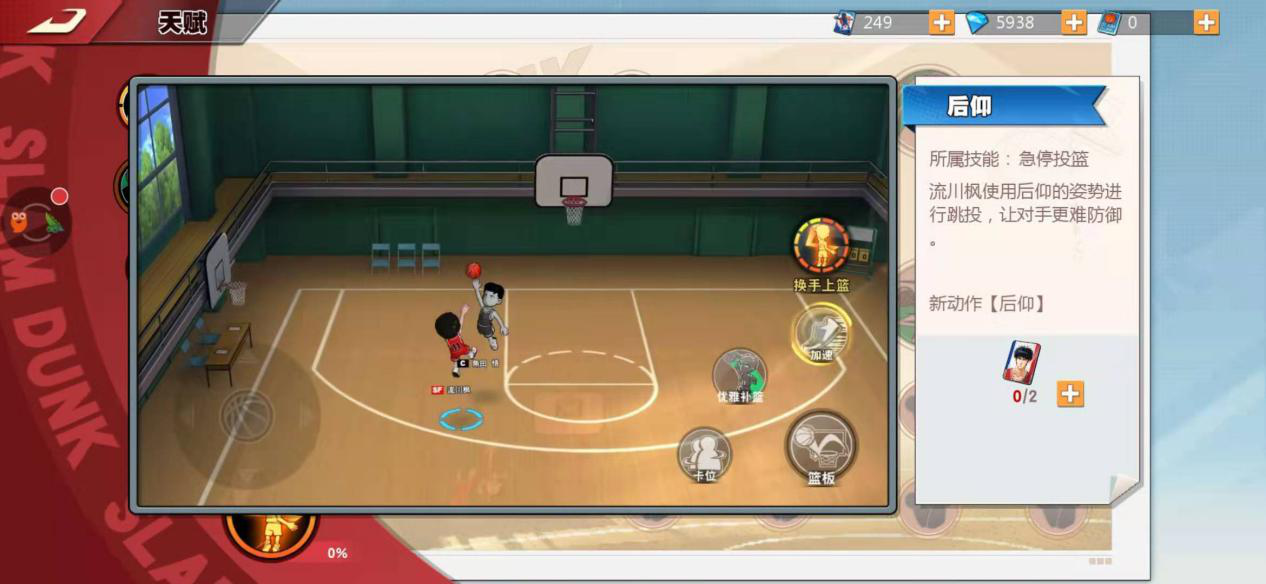 技能背身突破,流川枫凭借灵活的运球在背后切换球的方向,借此摆脱防守球员实现突破,这是他常用的突破招式,效果十分可靠。技能急停投篮,流川枫在运球推进时骤然停顿,拉开空间后直接起跳投篮,其优势在于能避开防守者的封盖,不过命中率会略低一些。