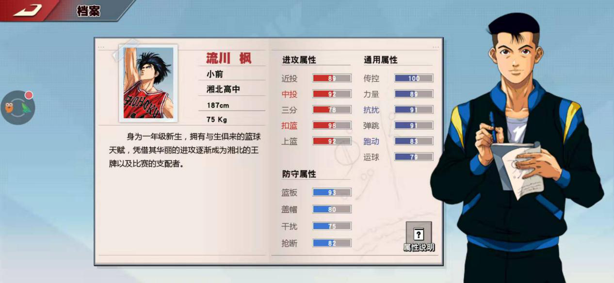 流川枫是湘北高中的一员,现在担任小前锋位置,有着“超级新星”的称号,以单打能力极强著称,是能胜任内线和外线的全能型前锋。从他的各项初始属性来看,近距离投篮、中距离投篮、扣篮、上篮、传球控球、抗干扰、弹跳以及篮板等多项数据都在90分以上,其中传球控球的初始能力更是达到了满分100点。