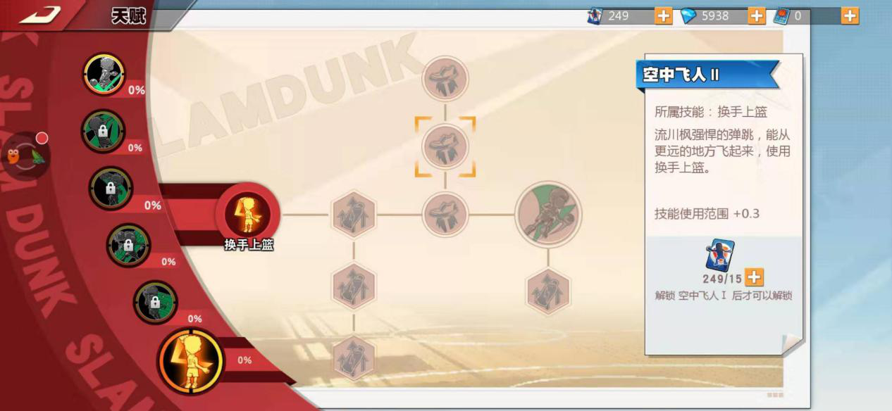 流川枫的招牌换手上篮是个极具观赏性的技能,在空中能完成换手动作,面对防守者的封盖毫无惧色,几乎势不可挡,一旦使出大概率得分。建议把大招天赋点选独行侠,这样能加快大招能量积攒,更频繁地用大招得分。