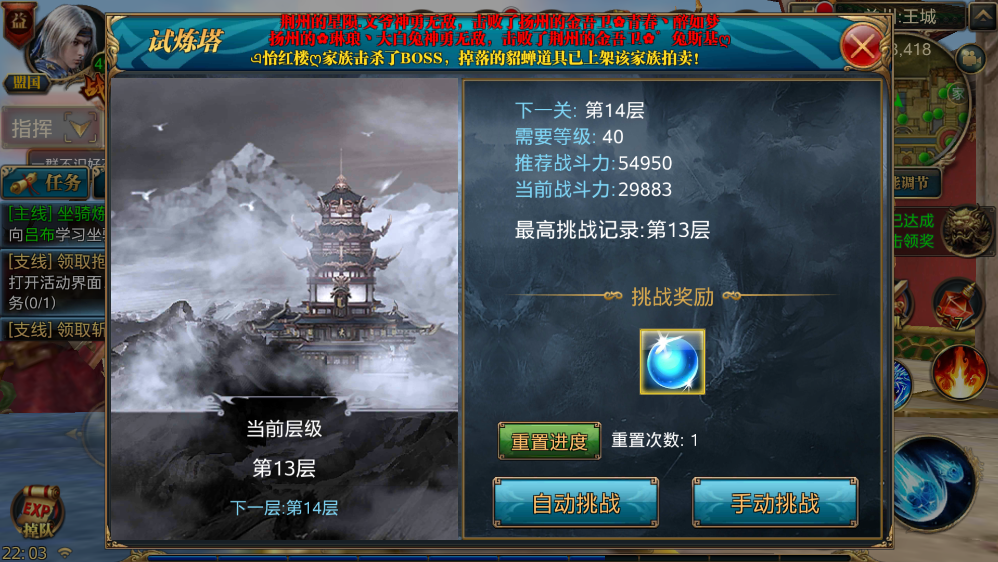 点击参与后,就能查看试炼塔的详细信息,包括自己的当前关卡、关卡所需等级、推荐挑战战斗力、自身当前战斗力以及个人记录,还可以重置进度。