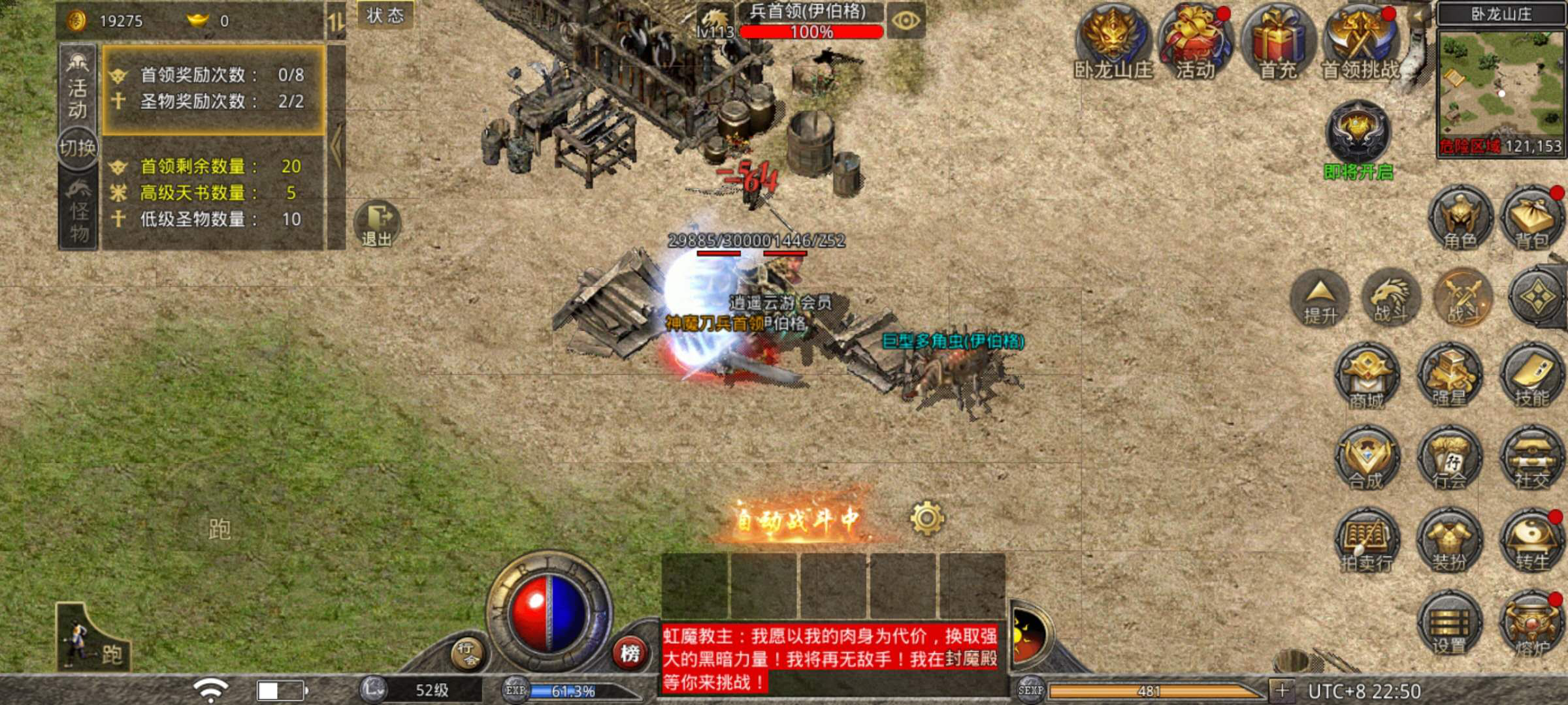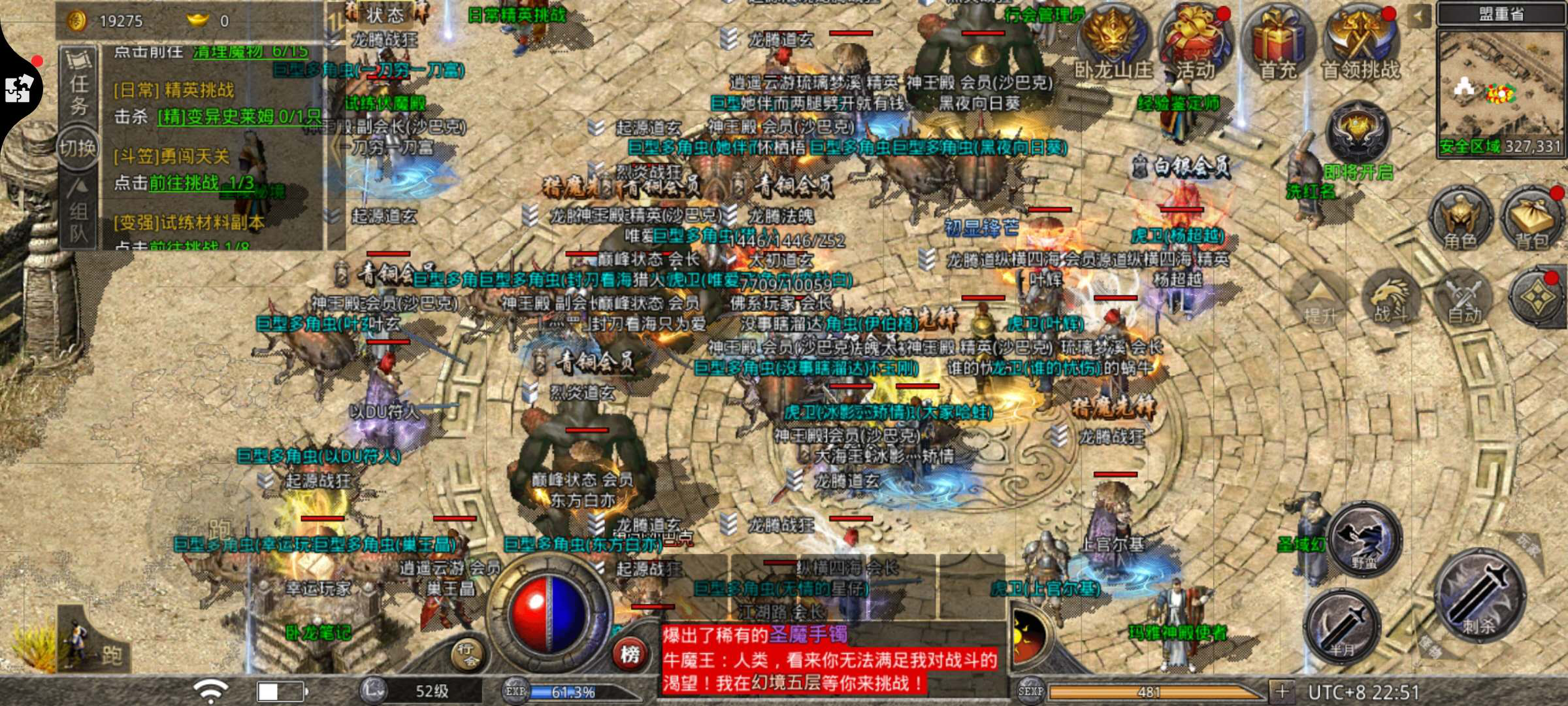 玩家随时都能进入遗迹挑战神龙与守卫,每个玩家没有次数限制,不过龙神实力强劲,要是攻击力不够高就很难造成伤害,只会白白消耗自身的药水和装备耐久。小编所在的服务器在攻打神龙时,采用的是行会集体挑战的方式。