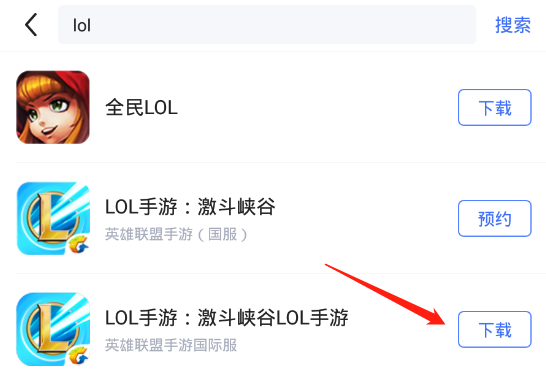 在首页点击右上角的【搜索】按钮,进入搜索界面后在搜索框中输入“lol”,就能在下方看到英雄联盟手游的相关结果,直接点击即可开始下载。